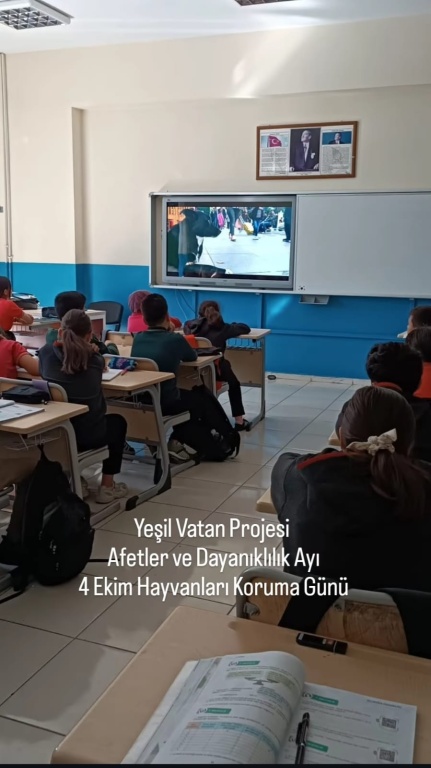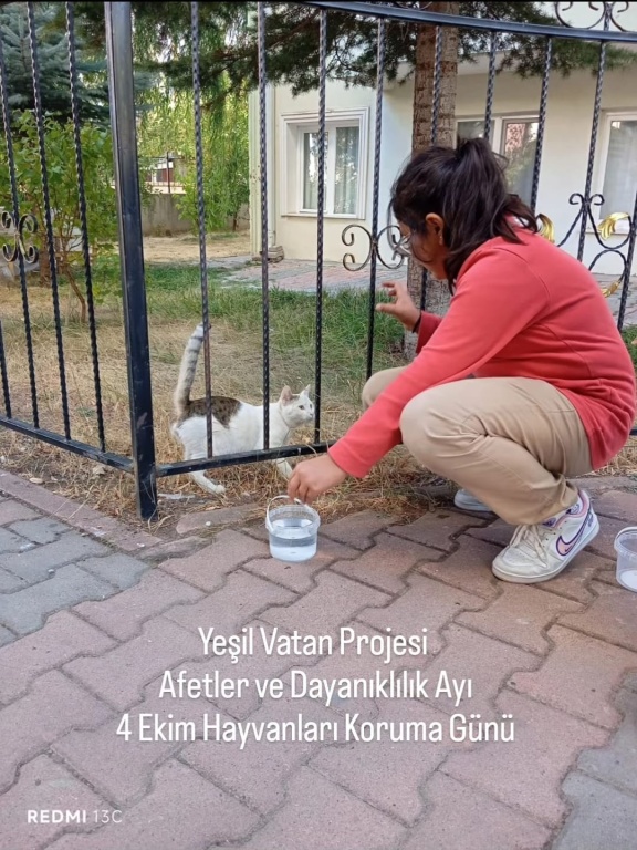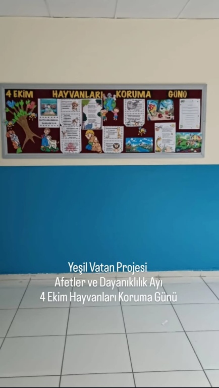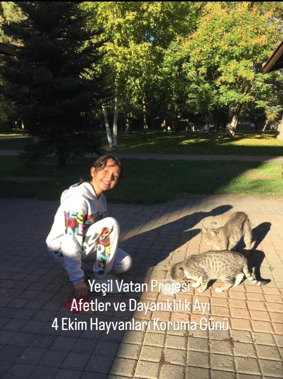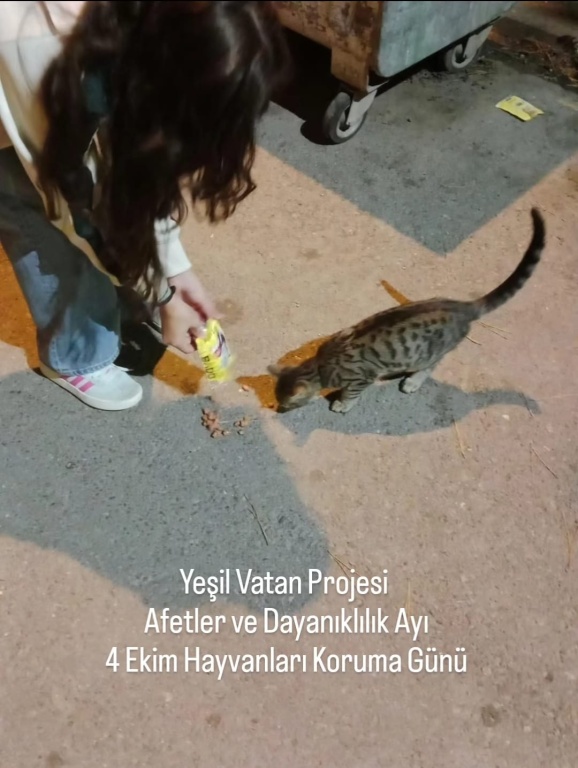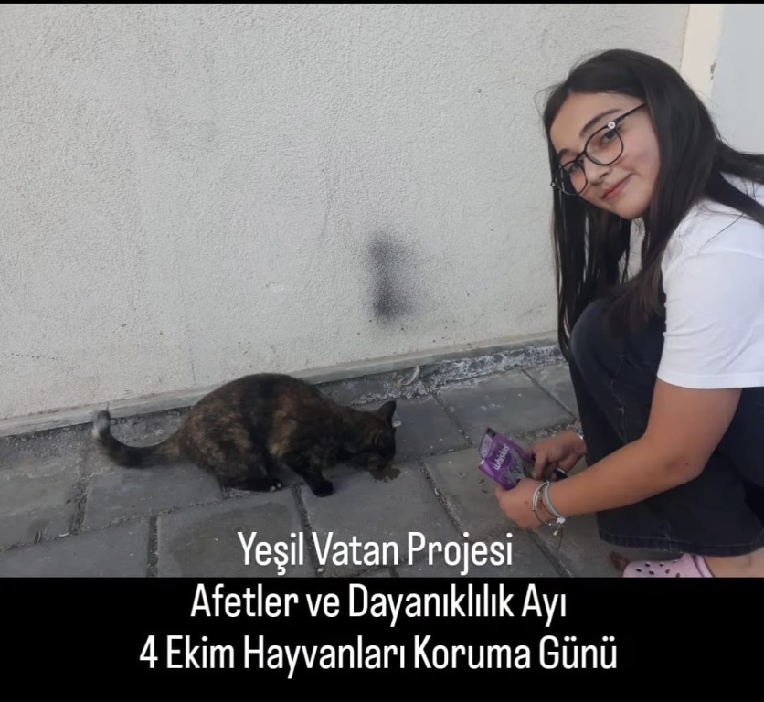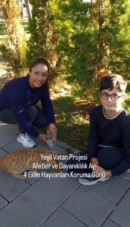 Yeşil Vatan Projesi, Afetler ve Dayanıklılık Ayı 4 Ekim Hayvanları Koruma Günü sebebiyle vicdanlı ,merhametli,doğa ve hayvan dostu bireyler yetistirmek ; hayvanların yaşam haklarına dikkat çekmek,bu konuda farkındalık oluşturmak adına ögrencilerimiz ve velilerimiz sokak hayvanlarının yanındaydı.İlgi ve sevgilerini dostlarımızdan esirgemeyen çocuklarımız , hem kendilerini hem de patili dostlarımızı mutlu ettiler.
